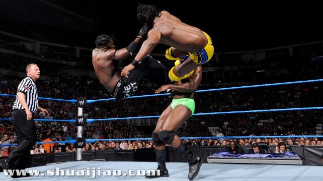 D-Young和R-Truth先上,双方互攻一番,R-Truth交接Kofi,Kofi直接柱顶就是Diving Crossbody压制,没,秒杀不成,再来一记“猴子穿绳”式的踢击命中D-Young,再顺带绳外Side Kick踢飞O’Neil。D-Young趁这时一记Elbow后来到绳外扛起Kofi,一记Belly-to-back Side Slam狠狠砸下,回台Elbow Drop后压制,Kofi挣脱。D-Young换O’Neil,O’Neil使出Powerslam,把Kofi推向角柱跟上Body Smash,想再来一次被Kofi踹倒。双方换上队友,R-Truth对着D-Young就是几拳,街舞挑衅后祭出Lie Detector,然后DDT,压制,一气呵成。O’Neil进来干扰,Kofi冲了进来,和R-Truth祭出Double Dropkick,再一记Slingshot Diving Crossbody砸倒掉下台的O’Neil!接下来就交给了R-Truth了,Jumping Reverse STO撂倒D-Young,压制,What’s up!
