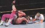 | 针对敌人的颈部进行攻击。这招一直是布雷特的“胜利方程式”之一。 | 跳水式锐角肘击炸裂!喜欢装死的瑞克·弗雷亚这下终于吃到苦头了…… | 虽然弗雷亚有必杀的足四字固定,但是布雷特的蝎子固定式还是胜出! | 让人跌破眼镜的初戴冠!这场比赛已经变成想看也看不到的梦幻试合了。 |
