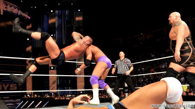 广告回来,轮到Sandow当受虐待对象,可是突然Sandow发力把Orton推回角柱边,Orton这下子一个打三个,但是双拳岂能敌四手,就这样三个年轻人连续交接几次消耗Orton!然后Cesaro一个跳跃的双脚踩,压制,两秒!Oh,boy,Cesaro惊人的力量,Gutwrench Suplex!压制,两秒!交接Cody,Cody进场锁住Orton,Orton很快反击,但又被Cody一个High Knee给踢翻了,Cody交接Sandow,Sandow一个漂亮的Side Russian legsweep,然后标志性的Elbow Drop!压制,两秒,Orton起来反击,Headlock Backbreaker!两组人分别交接,Sheamus对上Cody,Sheamus两个Clothesline,一个Conner Shoulder Tackle,一个High Knee,然后边绳的十连击胸,然后顺便给Sandow的胸口也是十拳,打得犹如行云流水般流畅!可是转身被Cody扣了一下边绳,Cody回到擂台,又被Sheamus扛起,White Noise!然后Sandow和Cesaro跑上擂台攻击Sheamus,Big Show进来给了Cesaro一个KO punch!然后将Sandow推给Orton,RKO!!!然后剩下的Cody免不了吃上一个Brogue Kick,压制3秒!