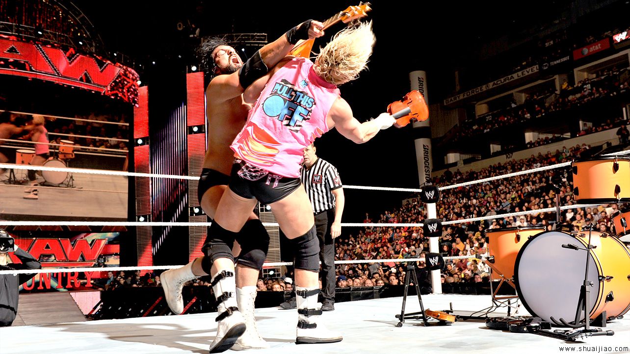 擂台上放了不少的吉他和鼓,开场Sandow就对Ziggler连续拳打脚踢,顺势将Ziggler扔出擂台,台下Sandow将Ziggler推向铁梯,操起一把吉他挥向Ziggler,Ziggler侥幸闪开后借助铁梯奋力跳起扑倒Sandow。回到擂台Sandow使用一个铁架子击倒Ziggler后连续的Elbow Smash,准备使用吉他时Ziggler反击,重拳击向Sandow头部,接着又是一个动作十分舒展的Drop Kick。Ziggler艰难爬上角柱,被Sandow推倒砸向擂台上的电子琴,电子琴被Ziggler砸得粉碎,Ziggler显得十分痛苦,Sandow压制没有成功。Sandow继续他的攻势,连续Head Butt后又是一阵暴打,接着Sandow拿起铁椅继续攻击Ziggler。Ziggler趁Sandow不注意一个技巧压制,没有成功。Ziggler反击暴打Sandow,Sandow起身用吉他击倒Ziggler,压制未成功。Ziggler使出DDT,压制,没有!Ziggler操起吉他砸向Sandow,接上一记ZigZag,压制还是没有!Ziggler想使出Blond Ambition,反Sandow抛起砸向擂台,接着又重重撞向架在擂台角的铁椅,Sandow压制,没有。Sandow用吉他攻击Ziggler后继续压制失败。Sandow冲向角柱的Ziggler,Ziggler躲开,Sandow撞到铁柱上,Ziggler压制失败后连续使用两个鼓击打Sandow的头,鼓面全部被击穿,接着拿起一把吉他砸在Sandow的头上,压制成功!