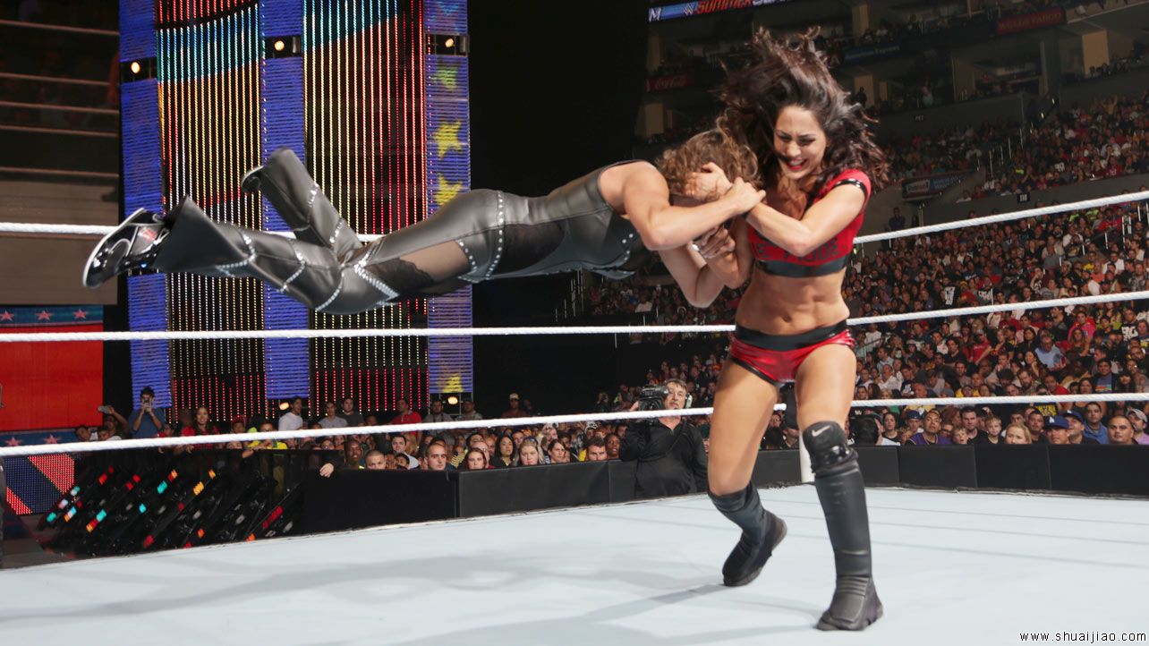 让我们来看看10年未摔角的斯蒂芬妮是否能如愿以偿击败布里呢,让我们看下面比赛,比赛开始,首先双方都在互相试探对方,两次试探后,斯蒂芬妮撂倒了布里,把布里拖到墙角肆虐,然后不断地用嘲讽性动作攻击布里,嘲讽之后直接举起布里就是一摔,斯蒂芬妮很得意,以为自己必胜,抓起布里想给布里一巴掌,布里趁机反击,挡住了斯蒂芬妮的手开始反击,想用Yes!" Lock让斯蒂芬妮求饶,斯蒂芬妮机智的逃下了擂台,布里想扑出来弄倒斯蒂芬妮,但是没有成功,布里扑出来的那一刻斯蒂芬妮重重的给了他一拳,输了么?