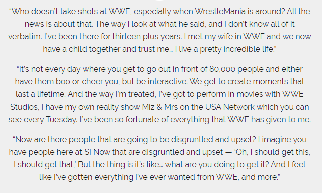 北京时间2019年4月5日,WWE明星选手米兹(The Miz)接受了《体育画报》的专访,谈及到了奥利弗对WWE抨击的看法,以下为采访精彩亮点。