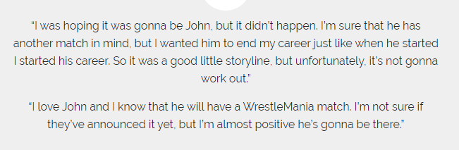 “我当然希望是对上约翰·塞纳,但最终并非实现!我很确信他心中有另一场比赛!我自然希望是他结束我的职业生涯,毕竟当年是我开启了他的职业生涯!我同他有过一段精彩的剧情,但最终我与他的比赛并未敲定!”