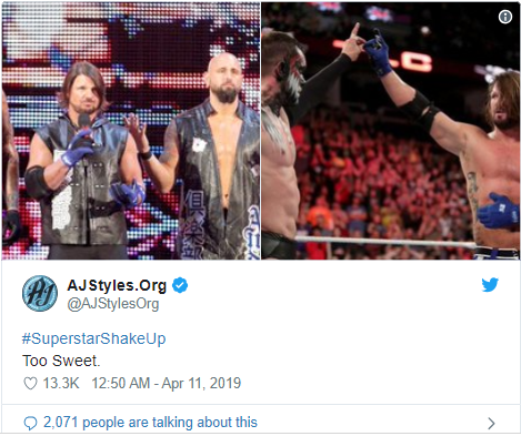 北京时间2019年4月11日,现象级大师AJ·斯泰尔斯(AJ Styles)在推特上更新了两张子弹帮的照片!