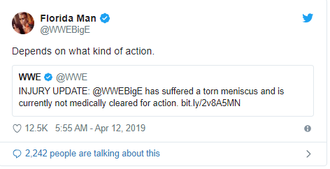 在本周进行的SmackDown节目中,大E不慎受伤,半月板撕裂,不过大E对此倒是挺乐观的!在WWE官方的这条推文下,大E评论了一句“那也得看是怎样的运动!”