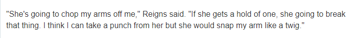 “她将直接扭断我的胳膊!如果她对任何人使出降服技,谁的胳膊都会保不住!我想我估计能吃她一拳,但我胳膊一定会被轻易扭断!”
