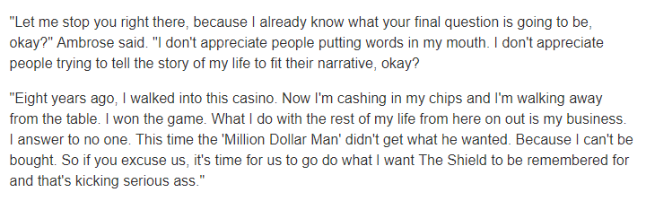 “八年之前,我进入了这家赌场(WWE),如今我已把赌场金币兑换成了现金,我将离开赌桌,赢得了这场赌局!我接下来要干什么,不关任何人的事!这次百万富翁(老麦)不能得偿所愿了,因为我根本不买他的账!而现在让我们去做我们圣盾最该做的事吧!那就是痛扁对手的菊!”