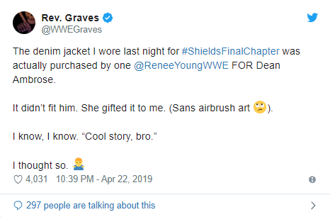 “我昨晚在《圣盾(The Shield)最后篇章》WWE现场秀上所穿着的那件牛仔服,其实是蕾妮·杨(Renee Young)给迪安·安布罗斯买的!但是他穿不下,因此蕾妮就送给我了!相当有‘意思’,对吧!我也这么认为!”