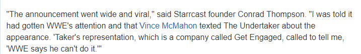 “当时那个消息传播得很快,很快就传到了老麦的耳朵里去了!当时老麦就给葬爷发了短信,不久之后,我就接受到了来自葬爷经纪人的来电!他告知我说,WWE不允许他参加《Starrcast II》。”