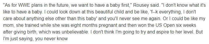 “至于WWE的未来,我打算先生了宝宝再说!我不知道有了宝宝会是怎样的感觉,看着那些可爱的小宝宝,我就会瞬间母爱爆棚,管它呢!其他我都不在意,先生了宝宝再说!或许之后你们再也看不到我了(暗指成为家庭主妇),或是像我妈妈那样,在她怀孕8个月之后开始训练,而在分娩结束6周之后,便赢得了全美公开赛!这实在太难以置信了!我不知道我能否跟上她的脚步,我只能说,未来谁也说不准!”