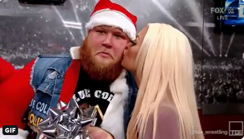 而由于今天SmackDown是圣诞特别版,重型机械在后台都戴上了圣诞帽!而采访临近结束的时候,曼迪·罗斯(Mandy Rose)突然向奥蒂斯(Otis)献了一个热吻!