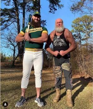 正如我们上图所看到的,黑羊同自己的父亲互换了行头,黑羊穿上了父亲当年的旧球服,而父亲则穿上了黑羊在WWE的那一身行头,这一切就犹如时光交错,仪式感十足!