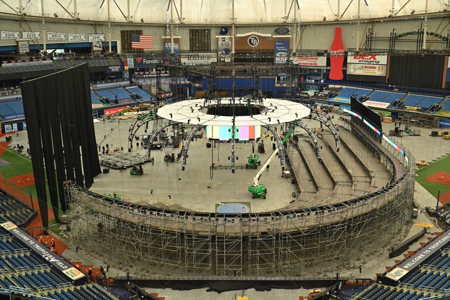 包括文斯·麦克曼(Vince McMahon),凯文·邓恩,现场布置设计师杰森·罗宾逊在内的高层都在纯品康纳体育中心指挥设备搭建工作!正如我们上图所看到的,现场搭建已有眉目!