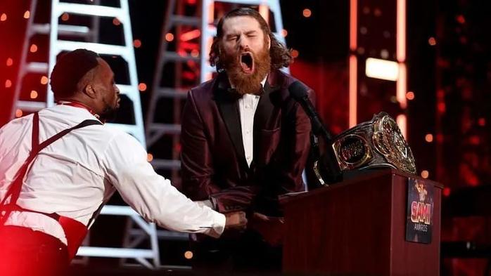 摔角网讯,上周的SD节目中,洲际冠军萨米·辛举办了萨米奖颁奖典礼,虽然前面比较顺利,但是最后却被大E(Big E)搅局,萨米还被大E揍了一顿。
