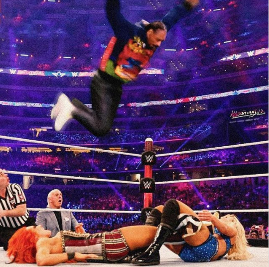而狗爷的表妹莎夏·班克斯(Sasha Banks)也以独特的方式来示爱狗爷!莎夏·班克斯将《摔角狂热》上,自己对贝基·林奇(Becky Lynch)以及夏洛特使出上绳飞扑的照片P成了狗爷!如下图!