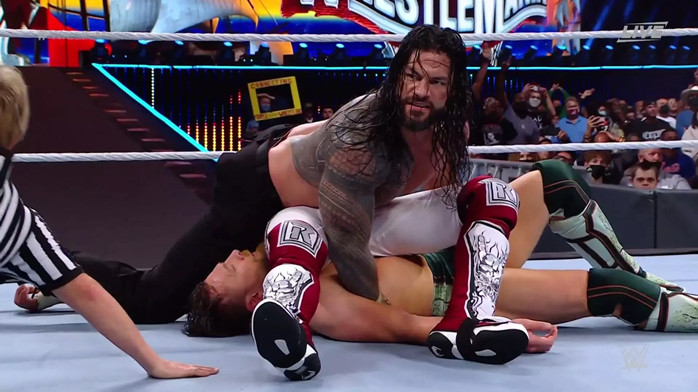 这是一场无规则赛,因此比赛中,任何道具都可以使用,而在场外的杰·乌索(Jey Uso)也会替罗曼去消耗他的两位对手!
