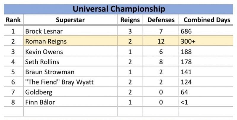 而今天外媒公布了WWE史上持有环球冠军的历史纪录,而这其中罗曼·雷恩斯已位居第二位,第一位为布洛克·莱斯纳(Brock Lesnar)!