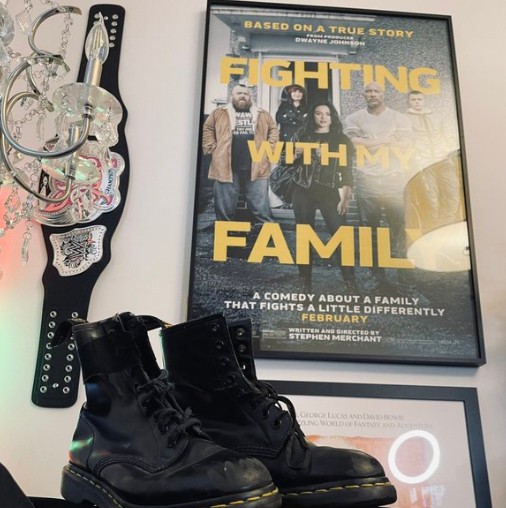 在这张照片中,我们看到墙上贴着以佩奇为原型拍摄的电影《为家而战》,旁边挂着的则是已经消失了的女郎冠军。下面,则是放着一双靴子,难道佩奇真的要回来了吗?各位摔迷怎么看此事呢?